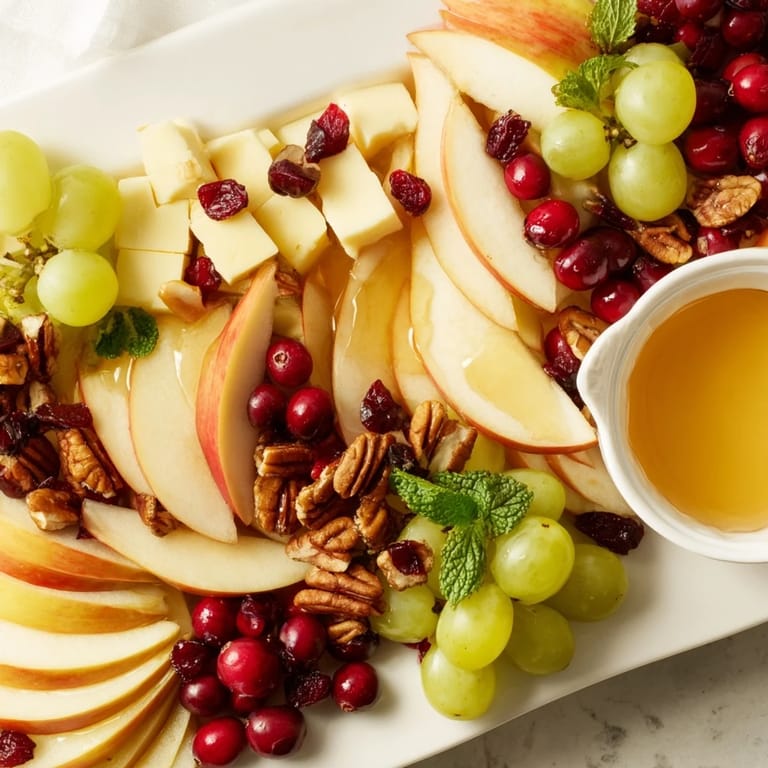 - Frisches Obst: 2 knackige Äpfel (z.B. Honeycrisp oder Gala), in Scheiben geschnitten, 1 Birne, in Scheiben geschnitten, 1 Tasse Trauben, halbiert, 1/2 Tasse getrocknete Cranberries, 1/2 Tasse Granatapfelkerne (optional)