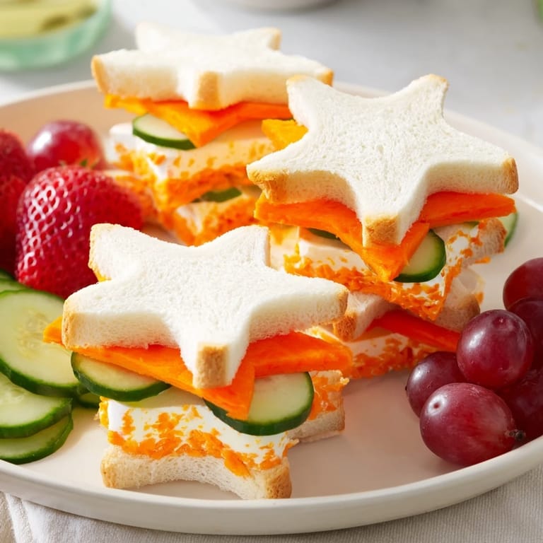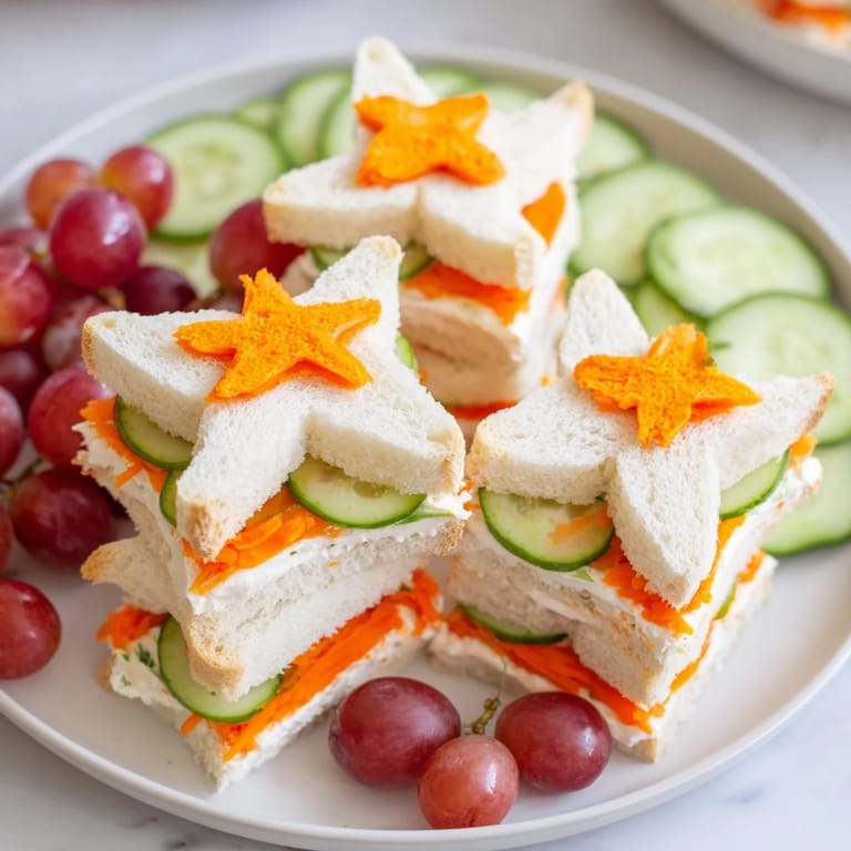- Seestern-Sandwiches: 12 Scheiben weiches Sandwichbrot, 6 EL Frischkäse (oder Hummus), 6 EL Marmelade, Nussbutter oder Aufschnitt (nach Wahl), 1 kleine Gurke, dünn geschnitten, 1 kleine Karotte, geschält und gerieben, 1 Seestern-Ausstecher (ca. 7-10 cm breit)