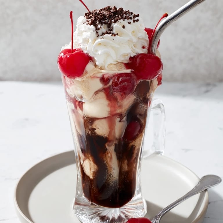 - Top with whipped cream, if desired, and sprinkle with grated dark chocolate. Garnish each float with a cherry and serve immediately with a straw and long spoon.