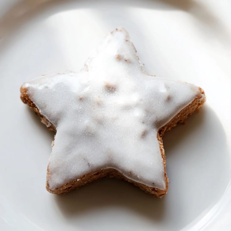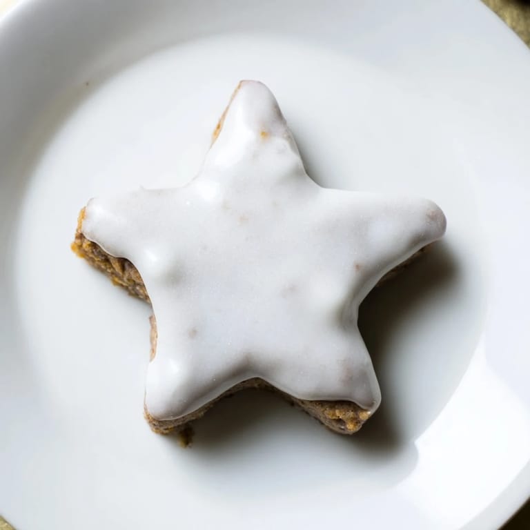 Merken Ein klassisches deutsches Weihnachtsgebäck aus gemahlenen Mandeln und Zimt, diese preiswerten Zimtsterne sind außen knusprig, innen zäh und mit einem süßen Überzug bestäubt.