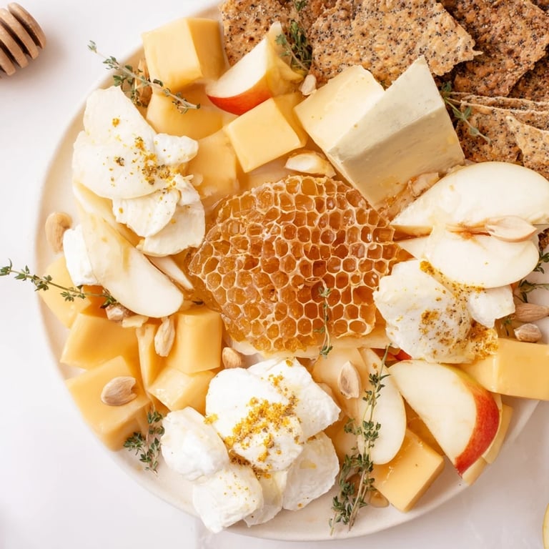 Merken Ein verspieltes, süß-salziges Snack-Tablett inspiriert von der Schönheit eines Wabenmusters, mit Honig, Käse, Früchten und knusprigen Bissen – perfekt zum Teilen.