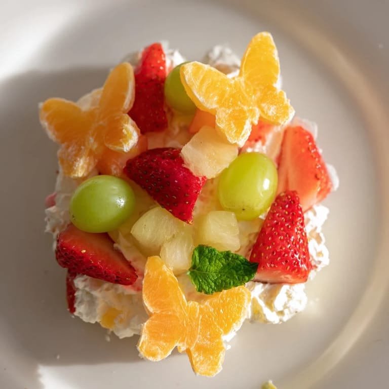 Merken Ein lebendiges, verspieltes Dessert-Tablett mit frischem Obst, cremigem Frischkäse und schmetterlingsförmigen Dekorationen – perfekt für Frühlingszusammenkünfte.