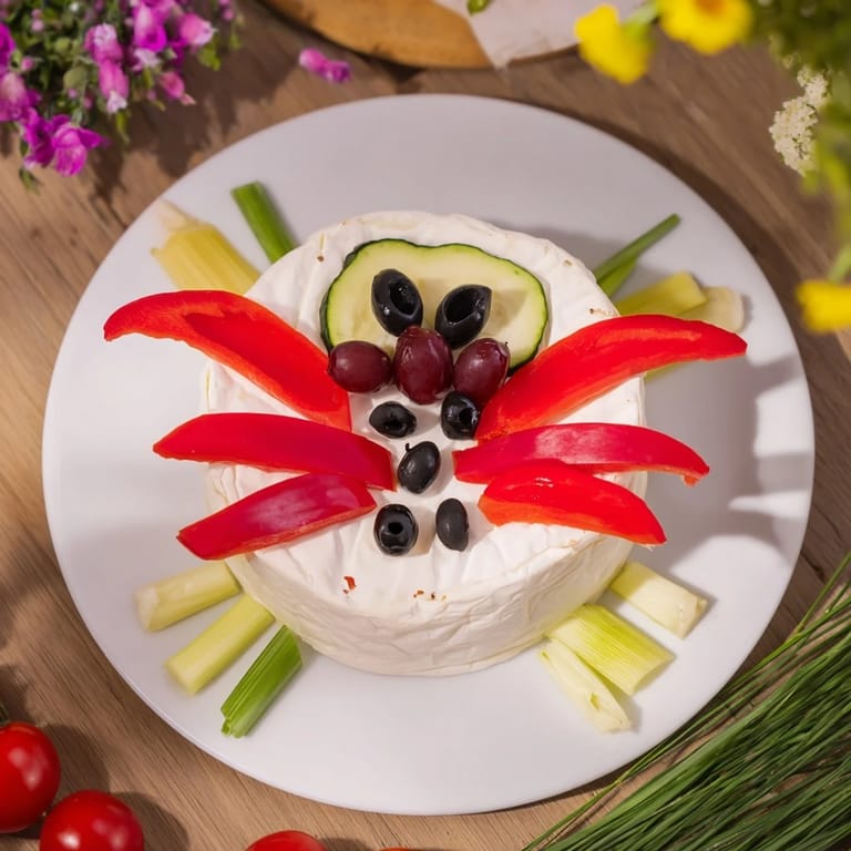 - Cherrytomaten, Möhrensticks und Gurkenscheiben ringsum arrangieren, sodass sie wie Gras und Blumen wirken.