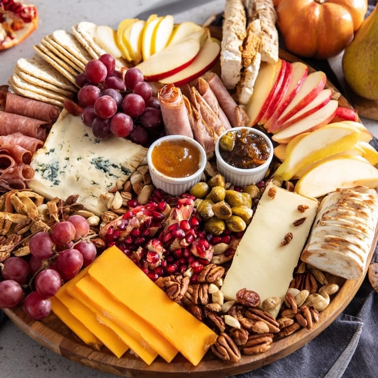 Merken Ein lebendiges, herbstlich inspiriertes Grazing-Board mit einer Auswahl an saisonalen Früchten, Käse, Aufschnitt, Nüssen und Beilagen—perfekt für festliche Zusammenkünfte und einfaches Servieren.