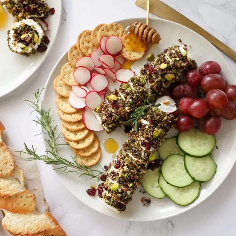 Merken Cranberry Ziegenkäse-Rollen Platten: Ein festlicher und geschmackvoller Aperitif mit cremigen Ziegenkäserollen, die mit süßen getrockneten Cranberries und knusprigen Nüssen überzogen sind und wunderschön mit Beilagen für eine beeindruckende Präsentation angerichtet werden.