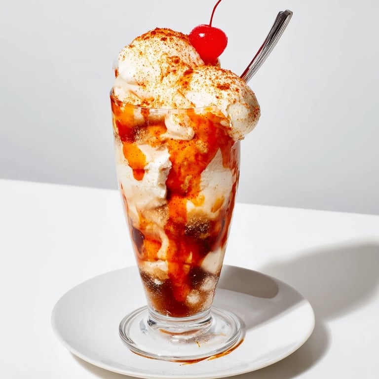 Merken Ein verspielter, würzig-süßer Soda-Float, inspiriert von der klassischen deutschen Currywurst. Tangige Tomaten-Curry-Sauce, cremiges Vanilleeis und Cola verschmelzen zu einem nostalgisch-rebellischen Genuss für experimentierfreudige Genießer.