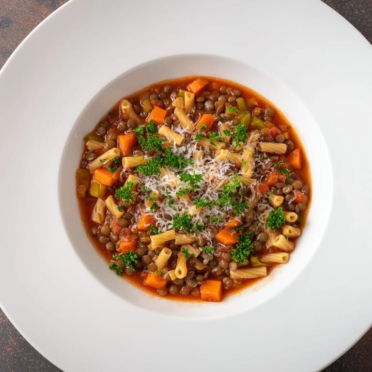 What makes this soup special is that none of the ingredients are fancy or hard to find, yet when they come together they create something that tastes far more interesting than any single component suggests. The lentils provide earthiness and substance, the pasta adds comfort, the tomatoes bring brightness, and the soffritto—that holy trinity of onion, carrot, and celery—ties everything into one coherent thought. It's the kind of cooking that reminds you that the best dishes aren't about complexity but about understanding how flavors support each other.
