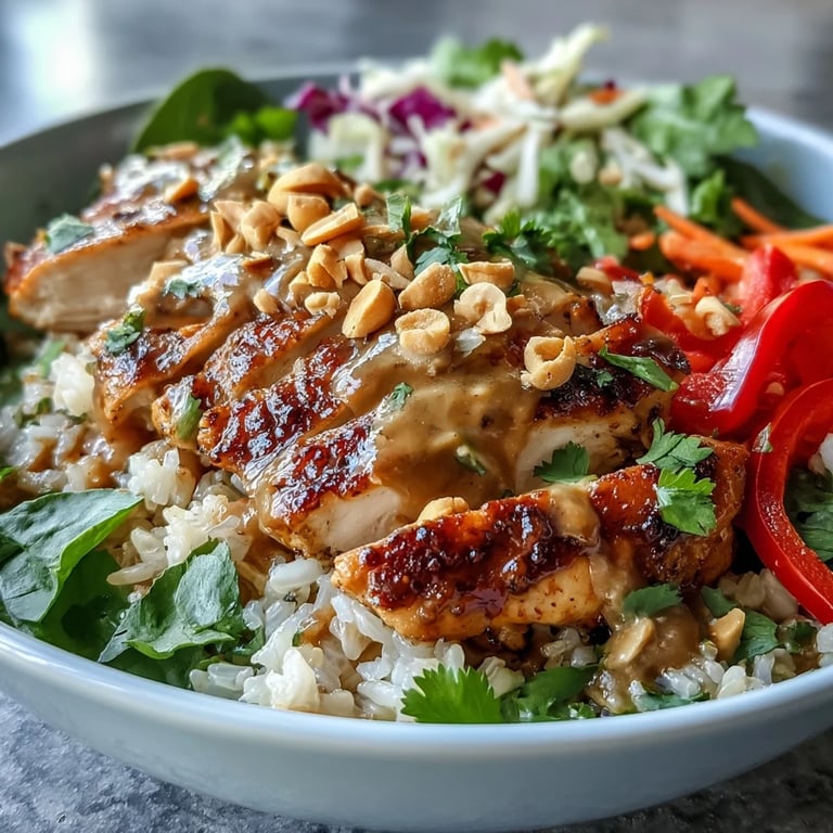 Merken Eines Nachmittags, als ich hungrig von einem langen Arbeitstag nach Hause kam, öffnete ich den Kühlschrank und fand dort ein einsames Hühnchenbrust, etwas Gemüse und ein Glas Erdnussbutter. Ich beschloss, diese Zutaten in etwas Großartiges zu verwandeln, und heraus kam diese wunderbare Power Bowl, die mich sofort in ihren Bann zog. Seitdem ist sie mein Lieblingsgericht für Tage geworden, an denen ich mich nähren möchte, ohne stundenlang in der Küche zu verbringen. Die Kombination aus zartem Hühnchen, cremiger Erdnusssauce und knackigem Gemüse fühlt sich gleichzeitig komfortabel und lebendig an. Jetzt bereite ich sie regelmäßig zu, und jedes Mal entdecke ich etwas Neues daran.