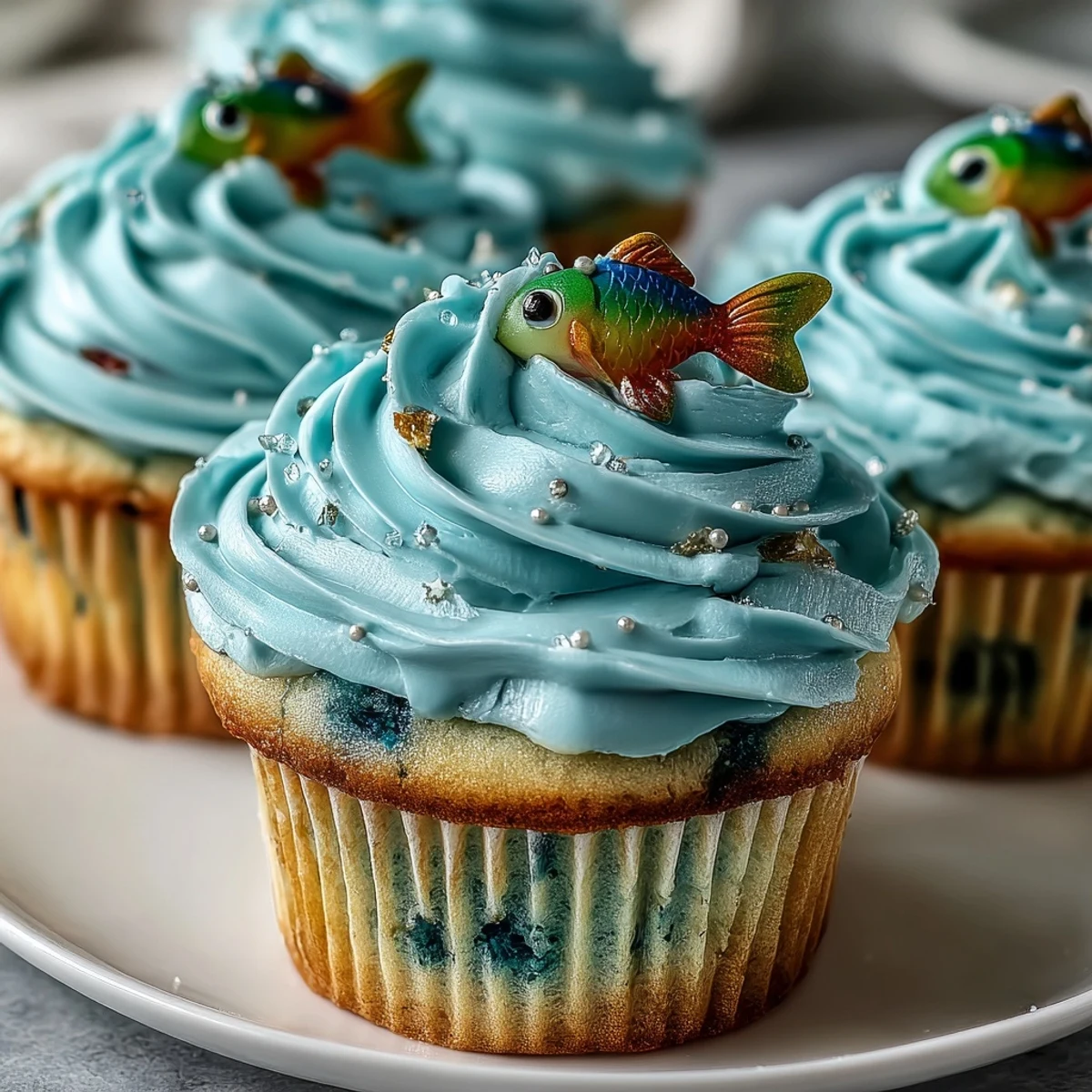 Feine Vanille Cupcakes mit blauer Buttercreme und detailreichen Fisch-Fondant-Deko.
