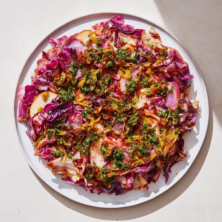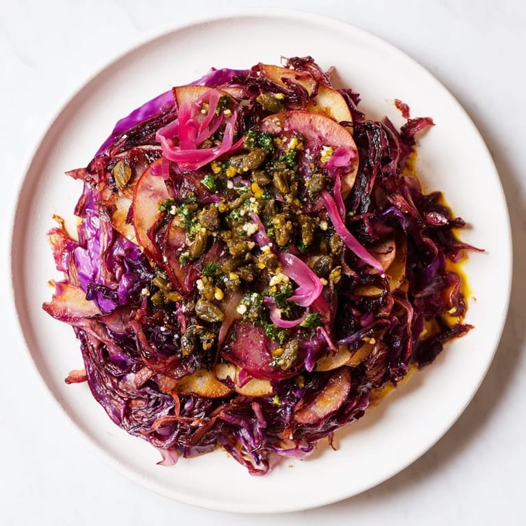 Merken Dieses aromatische Auflaufgericht aus Rotkohl wird mit wärmenden Gewürzen gebacken und mit einer frischen, kräuterhaltigen Salsa Verde serviert. Es eignet sich perfekt als festliche Beilage oder als vegetarisches Hauptgericht.