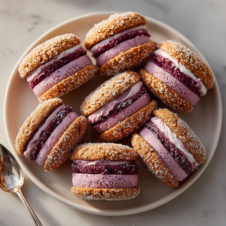 Die Sandwiches sehen toll aus, wenn sie am Rand in gehackten Pistazien oder bunten Zuckerstreuseln gewälzt werden. Besonders schön passt dazu ein Glas heißer Glühwein oder ein würziger Kaffee. Auch als besonderer Hingucker auf einem Brunchbuffet sind sie ein Volltreffer.