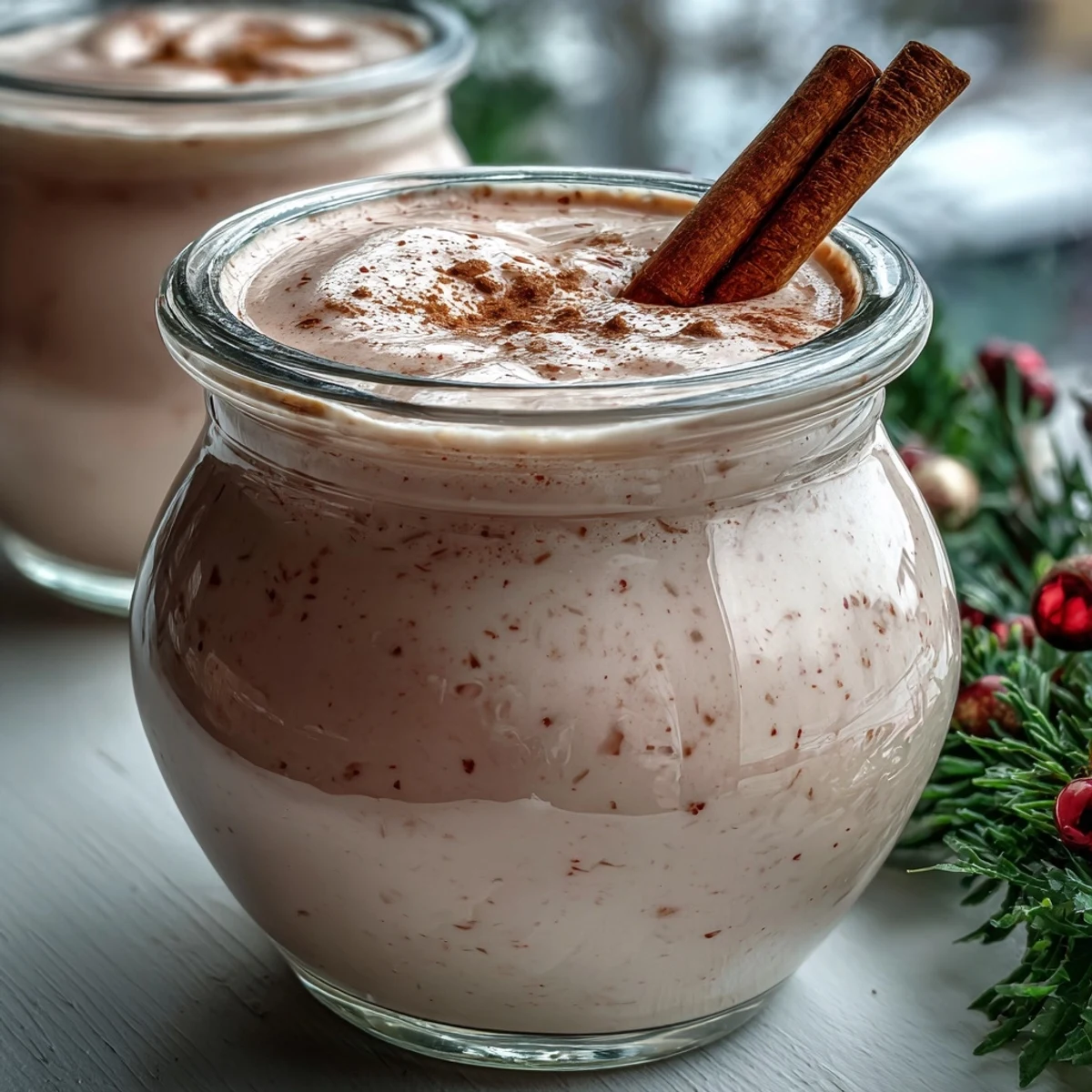 Serve this creamy drink cold in small festive glasses. A light dusting of ground cinnamon and a cinnamon stick garnish will enhance the aromatic experience and festive presentation.