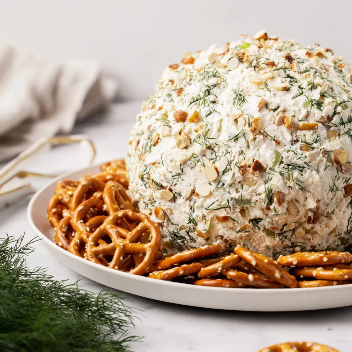Merken  Ein festlicher, würziger Käseball mit gehackten Gewürzgurken, frischen Kräutern und einer knusprigen Brezel-Hülle – das perfekte Highlight für jede Feiertagsrunde.