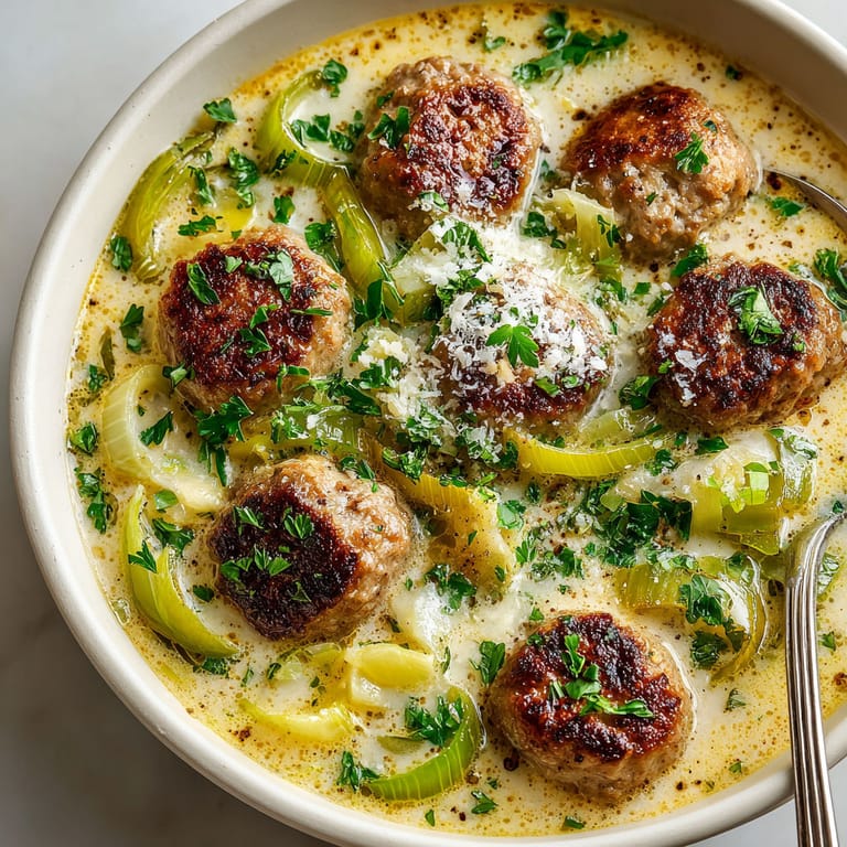 Merken Eine Käse-Lauch-Suppe mit Hackfleisch-Bällchen sorgt für herzhafte Gemütlichkeit an kalten Tagen und eignet sich perfekt für ein geselliges Abendessen mit Familie oder Freunden. Die Suppe überzeugt durch ihre sahnige Konsistenz, den aromatischen Käse und saftige Hackfleischbällchen. Sie ist unkompliziert im Alltag, schmeckt am nächsten Tag oft noch intensiver und bleibt ein Dauerbrenner in der deutschen Hausmannskost.