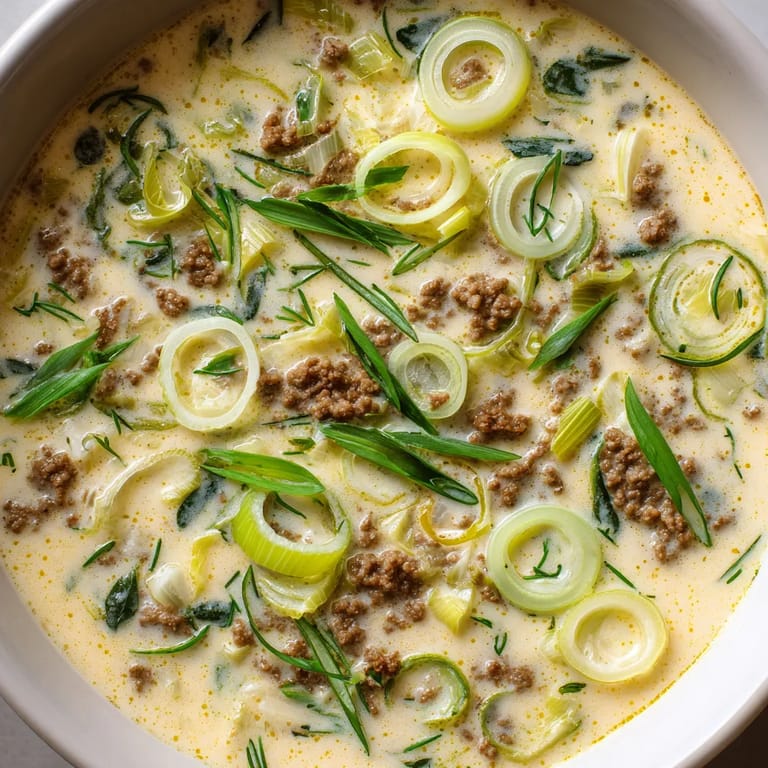 Merken Diese cremige Käse-Lauch-Suppe mit Hackfleisch ist mein go to Rezept, wenn es draußen kalt und grau ist und trotzdem schnell etwas Warmes auf den Tisch muss. Sie schmeckt nach echter Gemütlichkeit und macht sowohl kleine als auch große Esser satt und glücklich. Mit knusprigem Brot dazu ist es für meine Familie immer ein echtes Highlight.