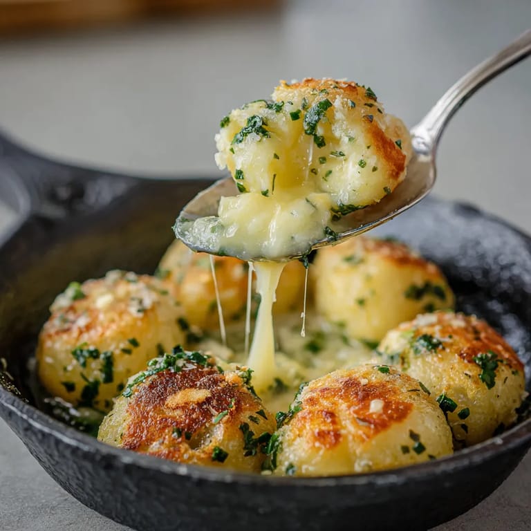 Diese Klöße sind cremig innen und außen wunderbar knusprig. Ein perfektes Gericht für Gäste, das sich gut vorbereiten lässt. Vegetarisch und nährend für die ganze Familie. Ich liebe besonders den Duft, wenn die Butter mit Knoblauch und Kräutern schmilzt. Das erinnert mich an Abende in der Familienküche, als wir zu zweit die Füllung extra gemacht haben, um sie später auf Brot zu streichen. Die Parmesan-Kruste macht jedes Kloß-Essen sofort besonders.