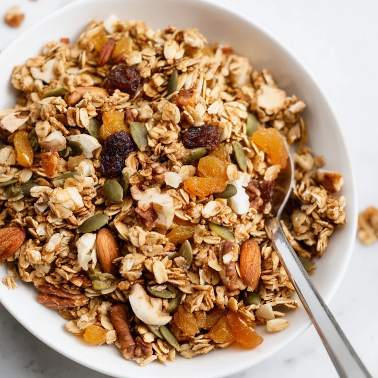 Wenn du gerade keine bestimmten Nüsse oder Samen im Haus hast, kein Problem. Haselnüsse, Cashews oder ein Esslöffel Leinsamen passen hervorragend dazu. Für ein veganes Granola ersetzt du Honig durch Ahornsirup oder Agavendicksaft. Zartbitterschokostückchen kannst du nach dem Auskühlen zugeben für extra Genuss.