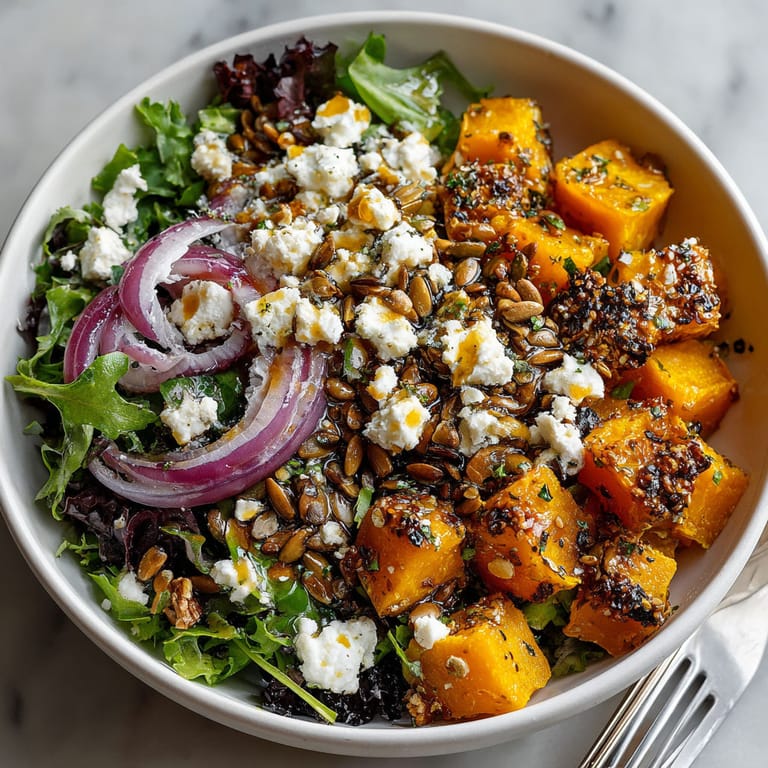 Merken Eine ausgewogene Schüssel mit geröstetem Kürbis, cremigem Ziegenkäse, knackigen Kürbiskernen, gerösteten Maronen und frischen Blattsalaten liefert wunderbare Aromen und gibt ordentlich Energie — ein modernes Gericht für gemütliche Abende oder ein gesundes Mittagessen.
