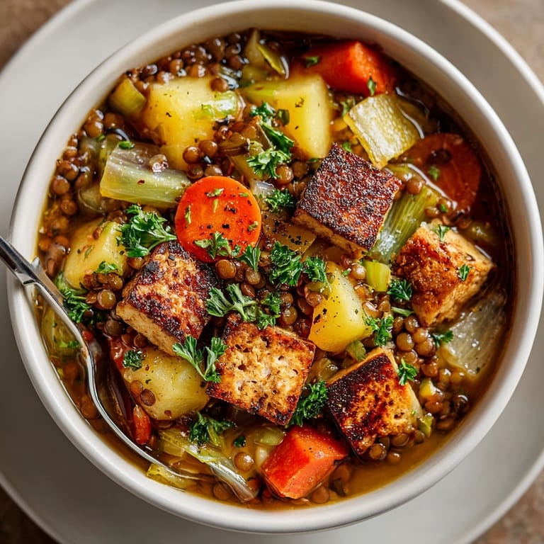 Merken Wer auf der Suche nach einer richtig sättigenden, cremigen und aromatischen Mahlzeit für kalte Tage ist, kommt an dieser deftigen Linsensuppe mit Rauchtofu und Kartoffeln einfach nicht vorbei. Sie verbindet traditionelle deutsche Suppenküche mit modernen, vegetarischen Zutaten und besticht durch ihren würzigen Geschmack, den selbst eingefleischte Fleischfans lieben werden. Ob für die Familienküche oder einen gemütlichen Abend mit Freunden — dieses Rezept wärmt garantiert Körper und Seele.