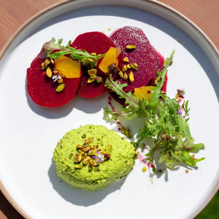 Dieses Menü präsentiert ein elegantes Dreiergespann aus saisonalen Komponenten: ein grüner Erbsen-Minz-Blend, fein karamellisierte Rote-Bete-Scheiben und eine cremige Ziegenkäse-Pistazien-Mousse. Attraktiv angerichtet in Form eines Kleeblatts, betont jedes Element frische, lebhafte Aromen und eine ausgewogene Textur. Die Zubereitung umfasst schonendes Blanchieren, sanftes Rösten und das harmonische Kombinieren von Kräutern und Nüssen, welche die intensive Frische und Cremigkeit unterstreichen. Serviert wird das Ganze mit aromatischen Baby-Ruccola-Blättern und essbaren Blüten – ideal, um Gäste mit einer kulinarischen Komposition zu beeindrucken.