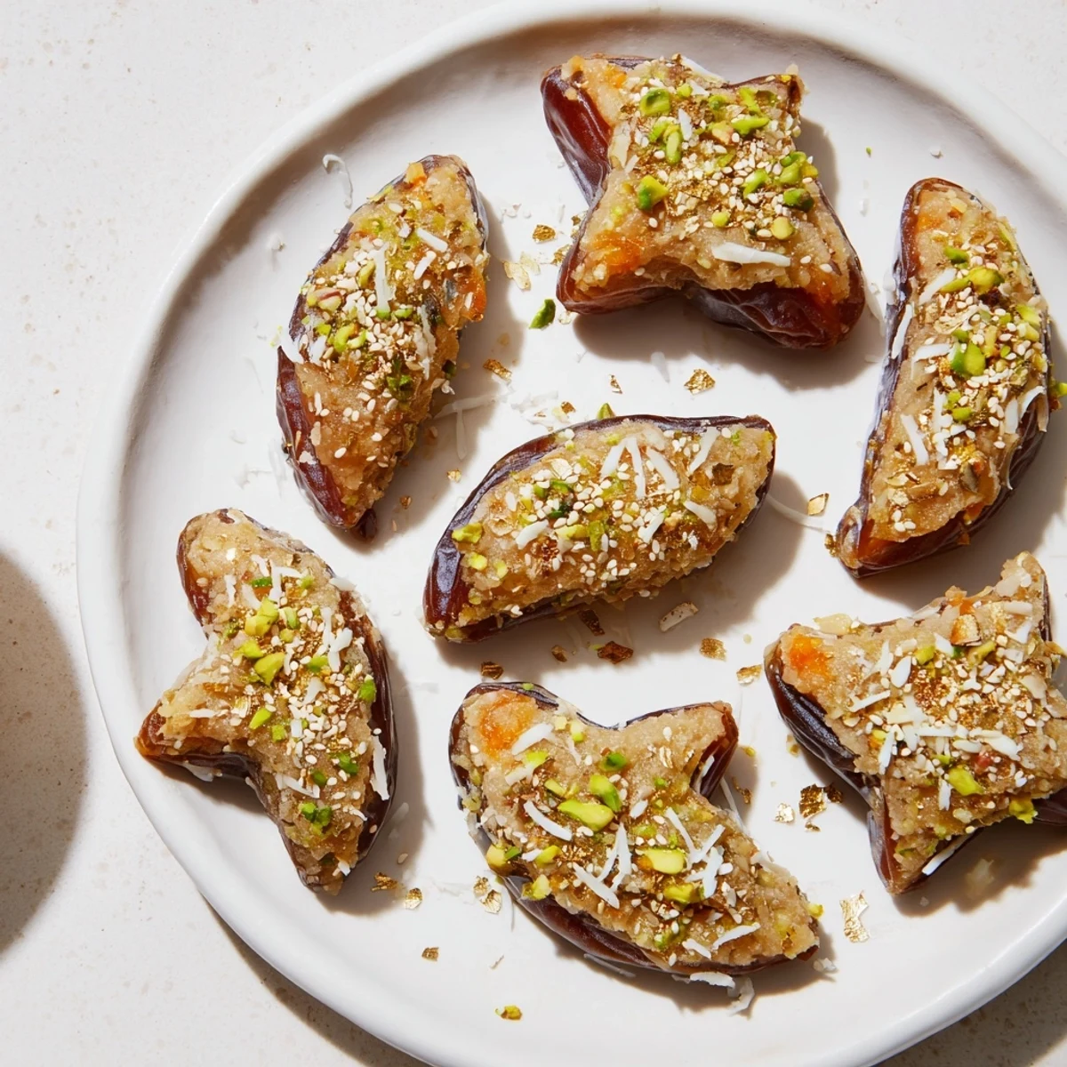 - Füllen Sie vorsichtig jede Dattel mit der Nussmischung, sodass sie den Konturen der Mond- und Sternformen folgt.