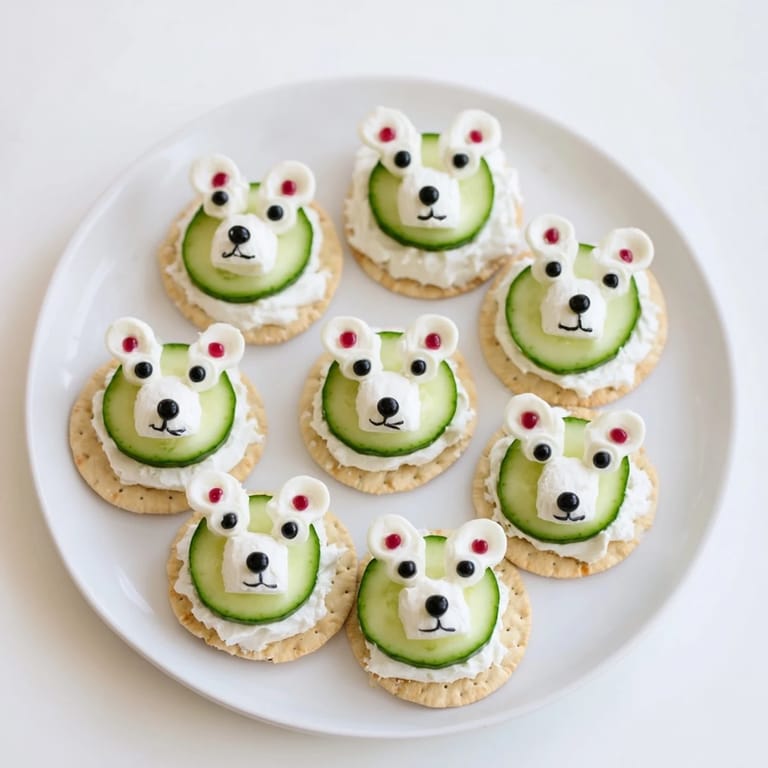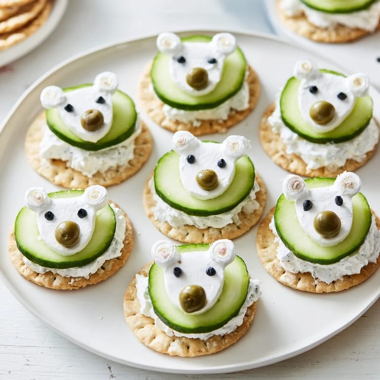 Merken Ein verspielter, herzhafter Snack mit kühlem Frischkäse, knackigem Gemüse und Crackern, die zu Eisbären auf treibenden Eisbergen gestapelt sind – perfekt für Partys oder Themenveranstaltungen.