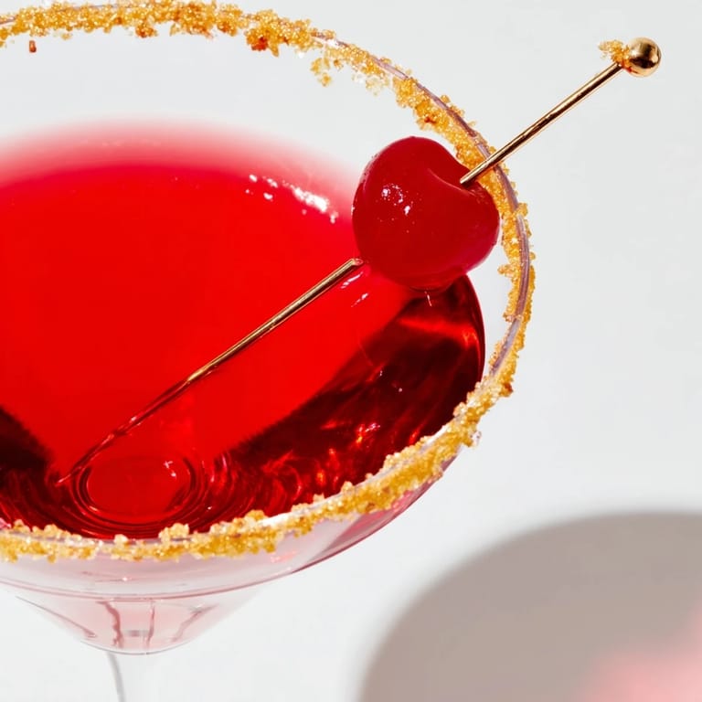 Merken Ein Rococo Kirsch Martini ist der Inbegriff luxuriöser Genussmomente: Mit Kirschlikör, hochwertigem Wodka und einem leuchtenden goldenen Zuckerrand ist dieser Cocktail ein echtes Highlight für festliche Anlässe.
