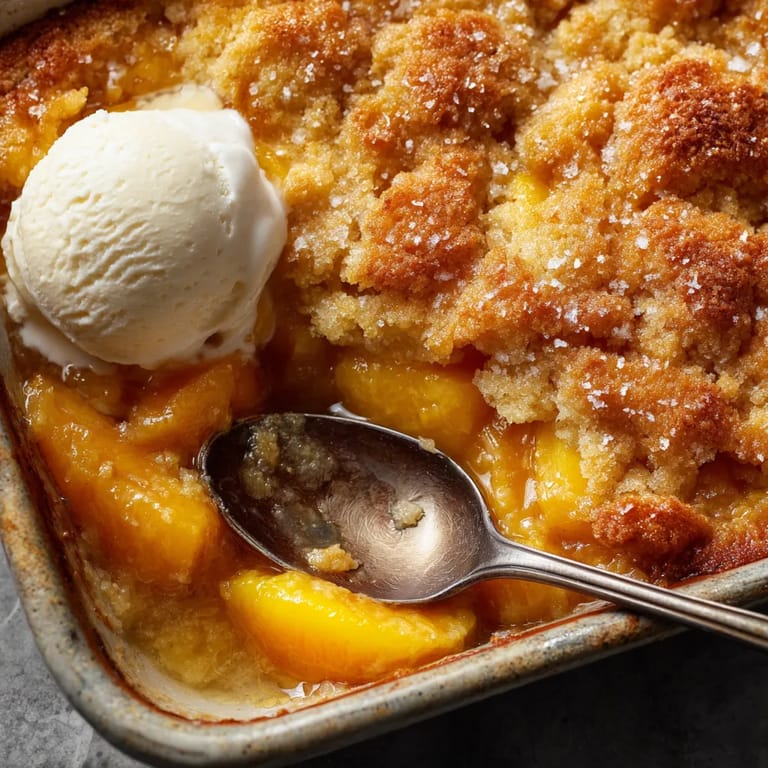 Merken Pfirsich Cobbler ist der Inbegriff eines unkomplizierten Sommerdesserts Ein lockerer goldbrauner Teigdeckel bedeckt saftige gebackene Pfirsiche und das Ergebnis wird am besten noch warm mit einer Kugel Vanilleeis genossen