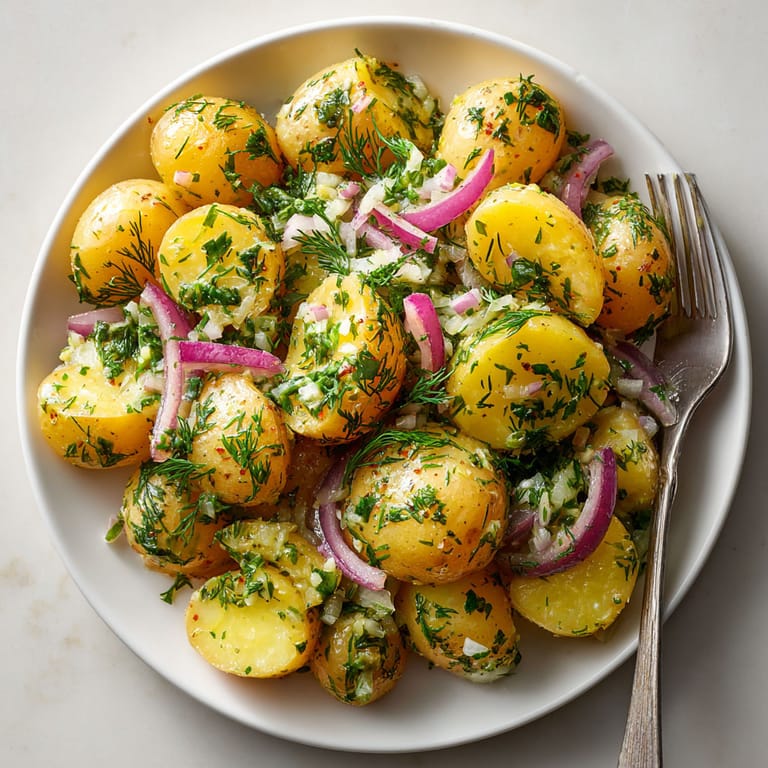 Merken Ein würziger, typisch deutscher Kartoffelsalat mit frischen Gewürzgurken, der in nur 15 Minuten zubereitet ist – ideal als sommerliche Beilage für Grillabende oder ein schnelles Mittagessen. Die Säure der Gurken und des Essigs gibt dem Klassiker einen besonderen Kick, gleichzeitig bleibt das Gericht vegetarisch und leicht.