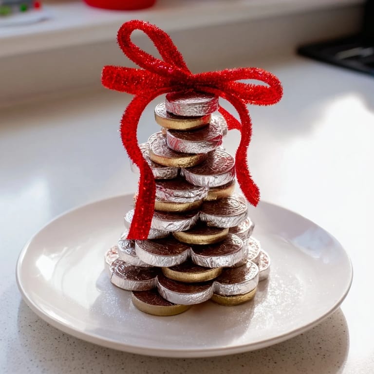 Merken Ein festliches und auffälliges Mittelstück mit Stapeln von schimmernden Schokoladen-Goldmünzen, perfekt für Feiertage, Partys oder besondere Anlässe. Diese no-bake Leckerei ist sowohl dekorativ als auch lecker und bringt eine Prise Verspieltheit und Süße auf jeden Tisch.