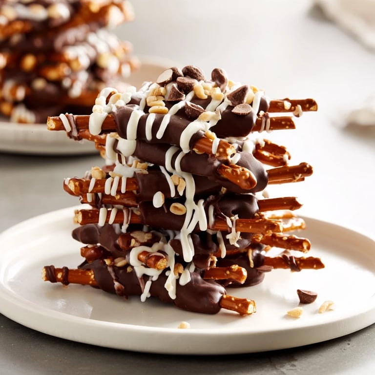 Merken Ein spaßiges, ungebackenes Dessert mit Schichten aus knusprigen Salzstangen und cremiger Schokolade, perfekt für Partys oder als schneller süßer Snack.