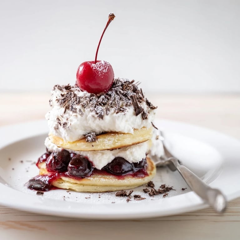 Merken Fluffige Mini-Pfannkuchen, geschichtet mit Kirschkompott, Schlagsahne und Schokoladenraspeln, inspiriert von der klassischen Schwarzwälder Kirschtorte. Perfekt für Brunch oder Dessert.