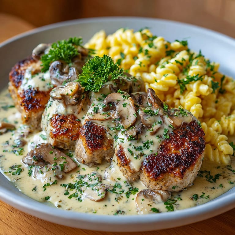 Merken Ich liebe es, für die Sauce besonders aromatische braune Champignons zu verwenden, weil sie etwas kräftiger schmecken. Besonders schön wird das Gericht, wenn man beim Kochen Zeit für den Duft der Butter und Pilze lässt — das erinnert mich immer an Sonntage in der Familienküche.