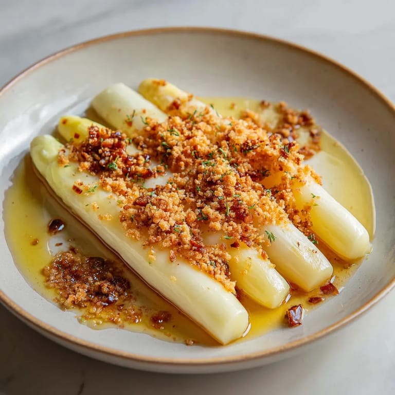 Merken Dieser zarte weiße Spargel mit nussiger brauner Butter und knusprigen Bröseln ist ein klassisches Frühlingsrezept, das Eleganz und Einfachheit perfekt verbindet. Die Kombination aus dem milden, leicht süßlichen Geschmack des weißen Spargels und der reichhaltigen Braunbutter hebt dieses Gericht auf ein ganz besonderes Niveau.