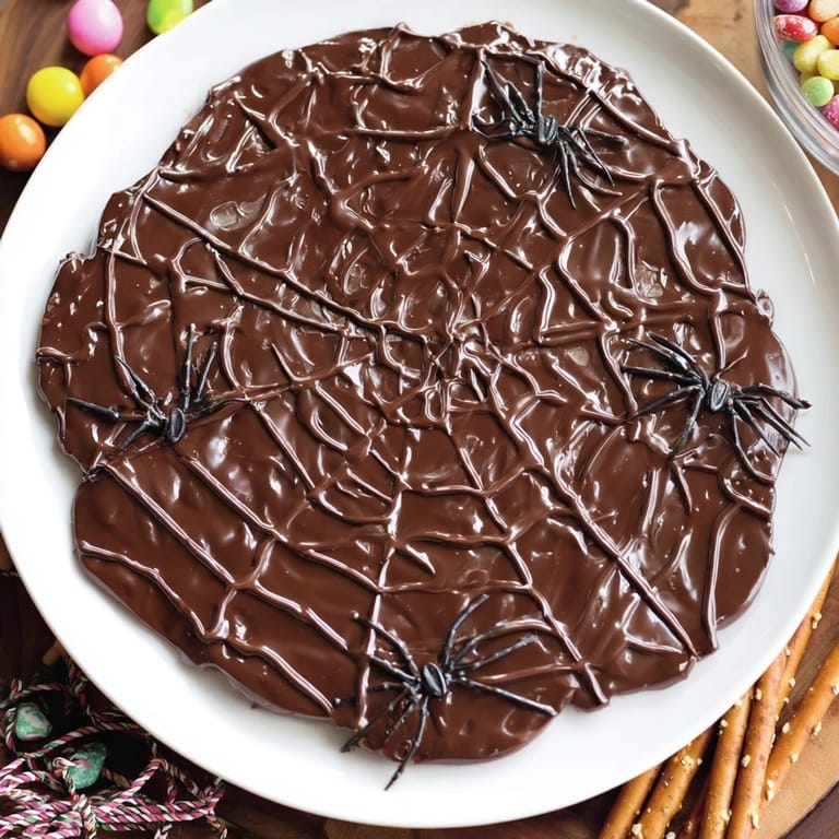Merken Eine unterhaltsame und schaurige Süßigkeitenschale, die in Form eines Spinnennetzes arrangiert ist, perfekt für Halloween-Partys oder thematische Zusammenkünfte. Diese Leckerei bietet eine Mischung aus Süßigkeiten mit einem dramatischen Schokoladenspinnennetz in der Mitte.
