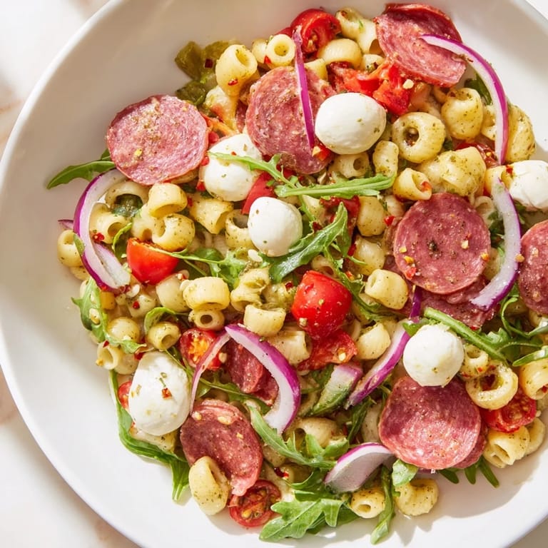 Merken Embrace the vibrant flavors of spring with this Antipasto Pasta Salad. Inspired by the viral grinder salad, this dish is a delightful medley of textures and tastes. It combines perfectly cooked ditalini pasta with peppery arugula, savory salami, creamy mozzarella pearls, and a colorful mix of tangy pickled vegetables. The whole salad is brought together with a bright, zesty dressing, making it an instant favorite for any picnic, potluck, or sunny afternoon meal.