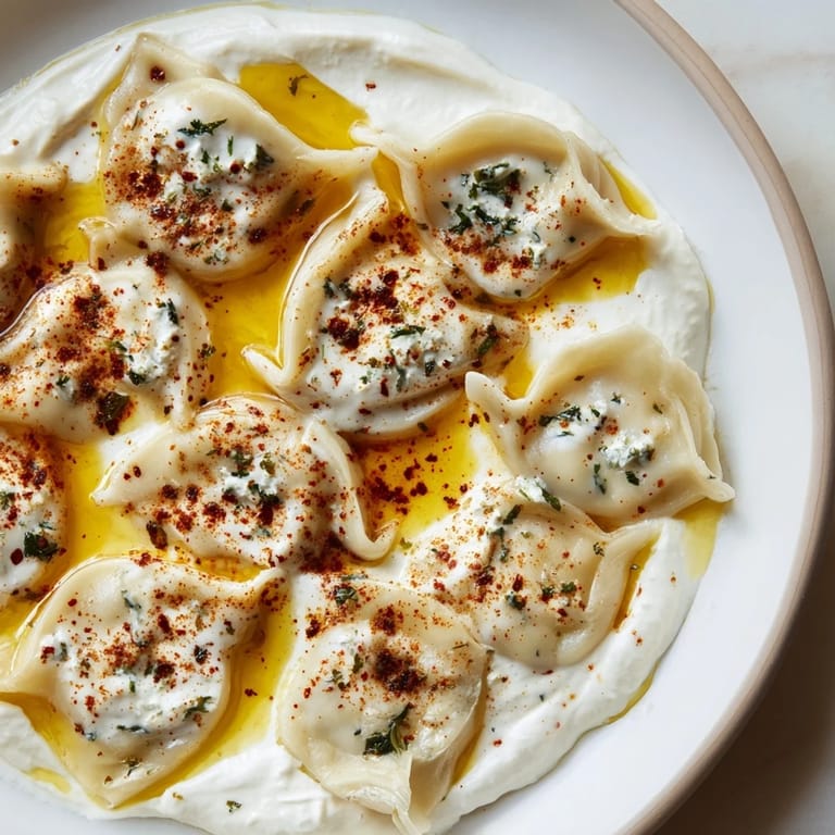 - Drain manti well, arrange on plates, spoon yogurt sauce over each serving, and drizzle with the spiced butter while everything is still warm. The heat matters here—cold manti lose their charm.