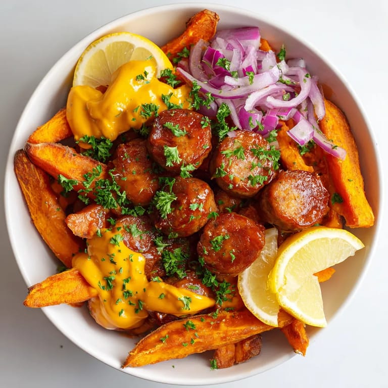 Merken Diese bunte Vegan Currywurst Glow-Bowl bringt den deutschen Streetfood-Klassiker neu interpretiert auf den Tisch – mit hausgemachter Seitanwurst, knackigen Süßkartoffelpommes und einer aromatischen Curry-Ketchup-Soße in einer sättigenden Bowl. Die frischen Toppings sorgen für knackige Abwechslung und machen das Gericht nicht nur köstlich, sondern auch zu einem echten Hingucker.