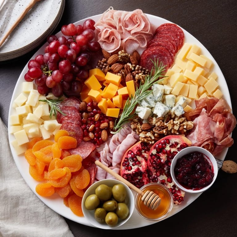 Merken Ein elegantes und buntes Sortiment aus handwerklich hergestellten Käsesorten, luftgetrockneten Fleischwaren, saisonalen Früchten und festlichen Leckereien, perfekt für die Feiertagsunterhaltung und zum Teilen.
