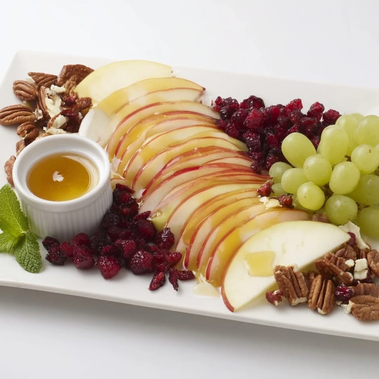 - Frisches Obst: 2 knackige Äpfel (z.B. Honeycrisp oder Gala), in Scheiben geschnitten, 1 Birne, in Scheiben geschnitten, 1 Tasse Trauben, halbiert, 1/2 Tasse getrocknete Cranberries, 1/2 Tasse Granatapfelkerne (optional)