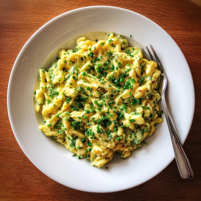 Diese bunte Pfanne kombiniert selbstgemachte vegane Spätzle, verfeinert mit aromatischem Bärlauchpesto, zu einer außergewöhnlich cremigen und würzigen Hauptspeise. Die fluffigen Nudeln werden zunächst in kochendem Wasser gegart und anschließend mit einer sahnigen, käsigen Sauce sowie sanft gedünsteten Zwiebeln in der Pfanne geschwenkt. Frische Kräuter sorgen für den letzten Schliff und bringen eine angenehme Frühlingsnote auf den Teller. Diese Variante ist nicht nur pflanzlich und vollmundig, sondern begeistert durch die harmonische Verbindung von Kräutern, veganer Käsesauce und nussigem Pesto. Ideal mit frischem Salat und einem Glas Riesling servieren.