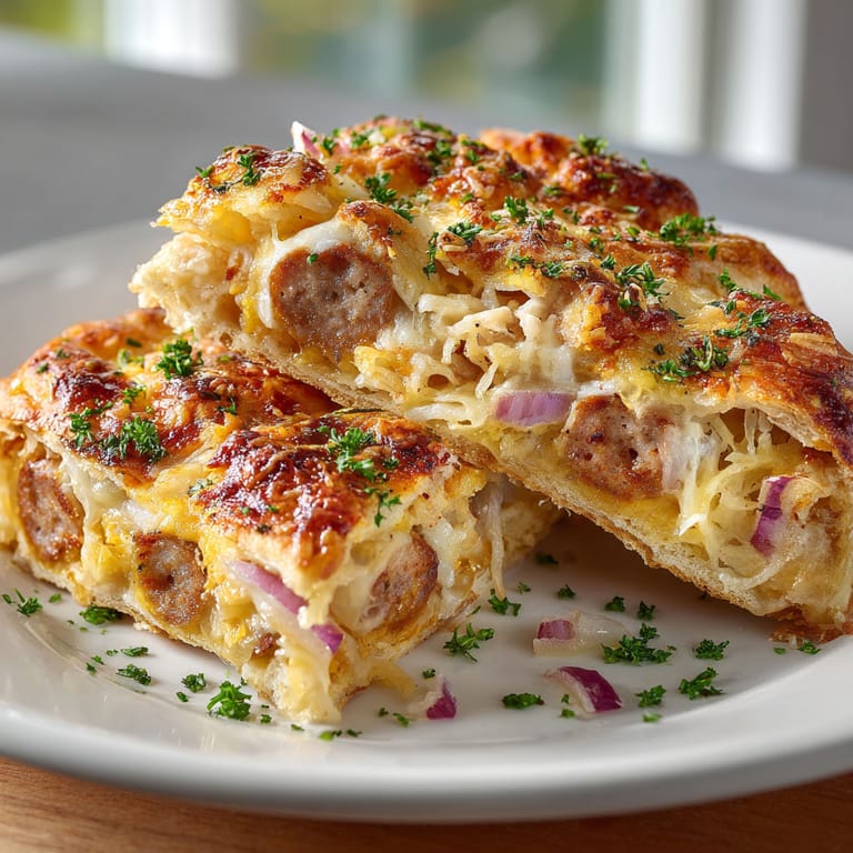 Merken Die Bratwurst-und-Sauerkraut-Pizza-Rollen sind der perfekte herzhaft-würzige Snack für gesellige Runden oder als kreatives Hauptgericht. Sie vereinen typisch deutsche Aromen mit einem amerikanischen Klassiker — so entsteht ein tolles Fusion-Gericht, das Gästen wie Familie immer ein Lächeln aufs Gesicht zaubert.