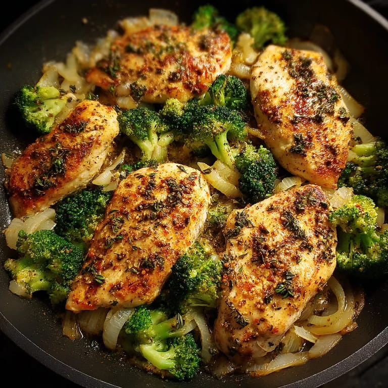 Zarte Hähnchenbrustfilets mit knackigem Brokkoli, Zwiebeln und aromatischen Gewürzen in einer schnellen Pfannenzubereitung.