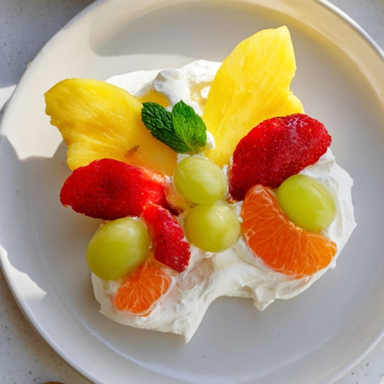 Merken Ein lebendiges, verspieltes Dessert-Tablett mit frischem Obst, cremigem Frischkäse und schmetterlingsförmigen Dekorationen – perfekt für Frühlingszusammenkünfte.