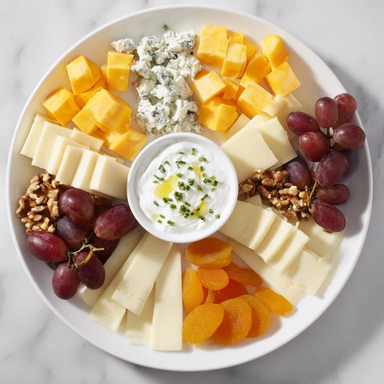 Teile die Platte optisch in vier Quadranten und lege jeden Käse getrennt um den zentralen Dip. Füge dazwischen Früchte und Nüsse für Farbe und Abwechslung hinzu.