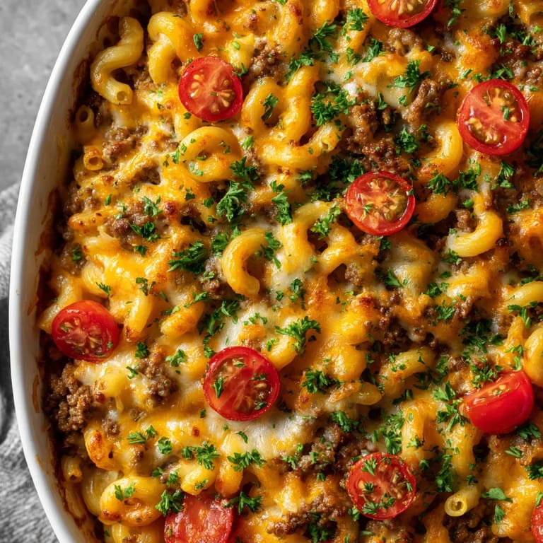 Dieser Cheeseburger-Auflauf vereint saftiges Rinderhack, aromatische Tomatensauce, Nudeln und eine goldbraune Käseschicht. Er wird unkompliziert in einer Auflaufform gebacken und eignet sich sowohl als gemütliches Familienessen als auch für Gäste. Die Kombination aus würziger Sauce, cremigem Käse und knackigen Gurken- oder Tomatenscheiben sorgt für ein abwechslungsreiches Geschmackserlebnis. Wer mag, kann zusätzliche Zutaten wie Schmand hinzufügen oder zu einer vegetarischen Variante greifen. Das Gericht ist einfach in der Zubereitung und überzeugt durch seinen vollmundigen Geschmack.