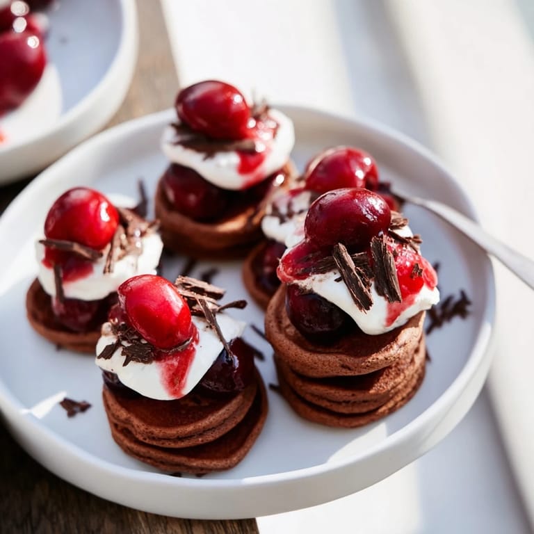 Merken Mini-Schokoladen-Pfannkuchen, belegt mit Kirschkompott und Schlagsahne. Diese Fusion-Dessert vereint klassische Schwarzwälder Aromen mit einem verspielten Cherry-Cola-Twist und sorgt für ein ganz besonderes Geschmackserlebnis.