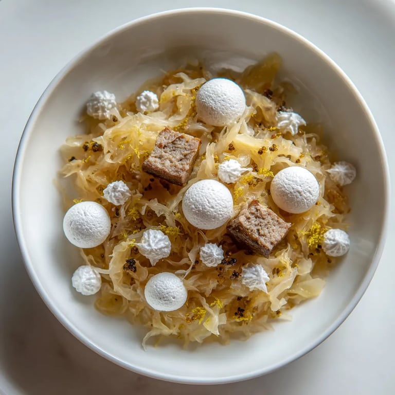 Merken Diese Choucroute sucrée à la citronnelle mit salziger Meringue ist eine eigenwillige Neuinterpretation des französischen Klassikers. Fermentierter Kohl bekommt hier durch duftende Zitronengras-Noten und knusprige Mini-Meringues mit Limettenzeste ein ungewöhnlich frisches und luftiges Finish. Dazu eine Scheibe würziges Leberpastete – so entsteht eine außergewöhnliche Geschmackskombination zwischen Herzhaftigkeit, feiner Süße und knackigen Akzenten. Perfekt für neugierige Genießer, die gerne experimentieren.