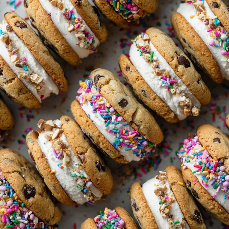 Diese Eiscreme-Cookie-Sandwiches sind der Inbegriff sommerlicher Leichtigkeit und machen jede Feier oder Kaffeepause zu einem kleinen Fest. Zwei saftige Cookies umhüllen eine cremige Schicht Vanilleeis – ein kinderleichter Klassiker, den jeder liebt und der sich ganz individuell verzieren lässt. Ob als blitzschnelles Dessert für Gäste oder als süße Belohnung für Zwischendurch, dieses Rezept bringt große Freude in wenigen Minuten.