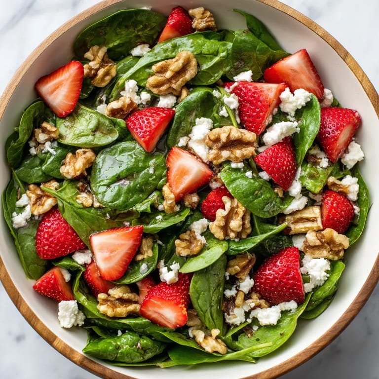 Merken Dieser Erdbeer-Spinat-Salat ist meine Rettung für schnelle Sommermahlzeiten, wenn frische Erdbeeren in Hülle und Fülle erhältlich sind. Die Kombination aus süßen Früchten, würzigem Käse und knackigem Spinat schafft ein Geschmackserlebnis, das sowohl erfrischend als auch sättigend ist.